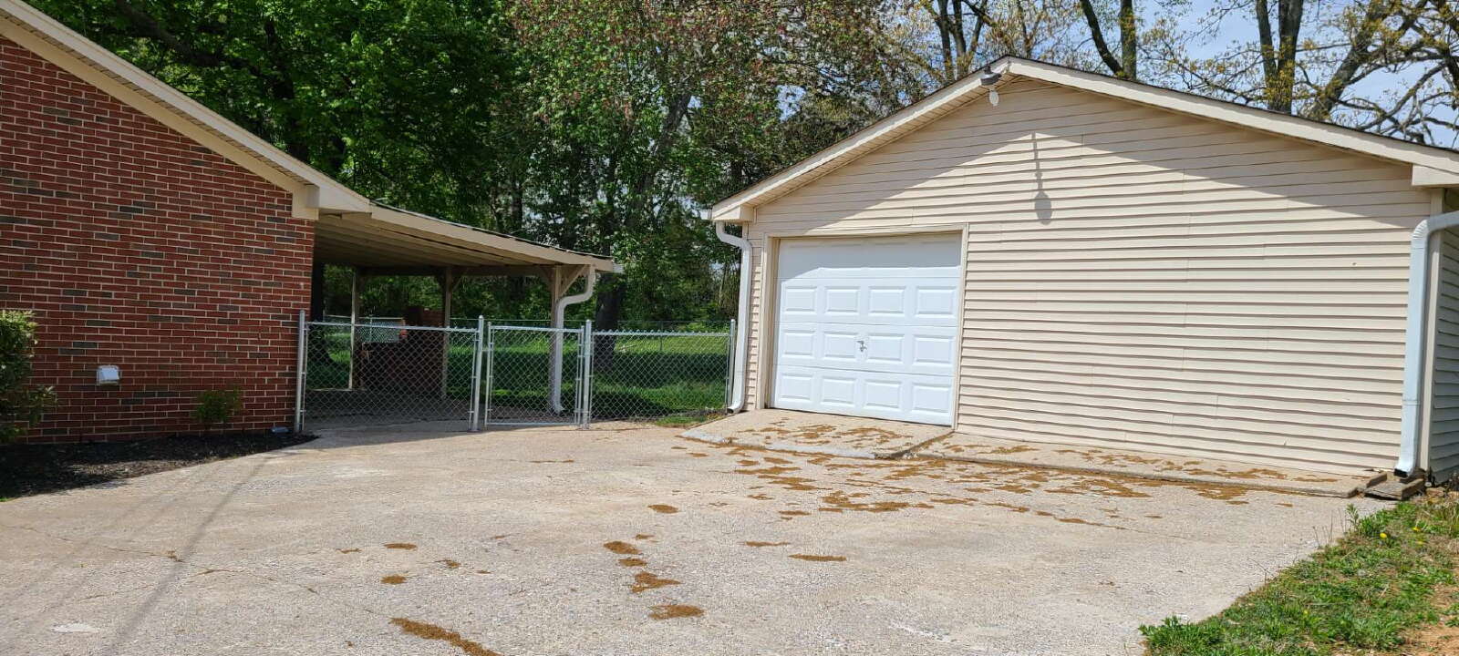 The layout offers comfortable living areas with a large utility/laundry room that provides added storage. Outdoor highlights include a fenced backyard, covered patio, concrete driveway, and a large detached garage with ample storage or workspace.