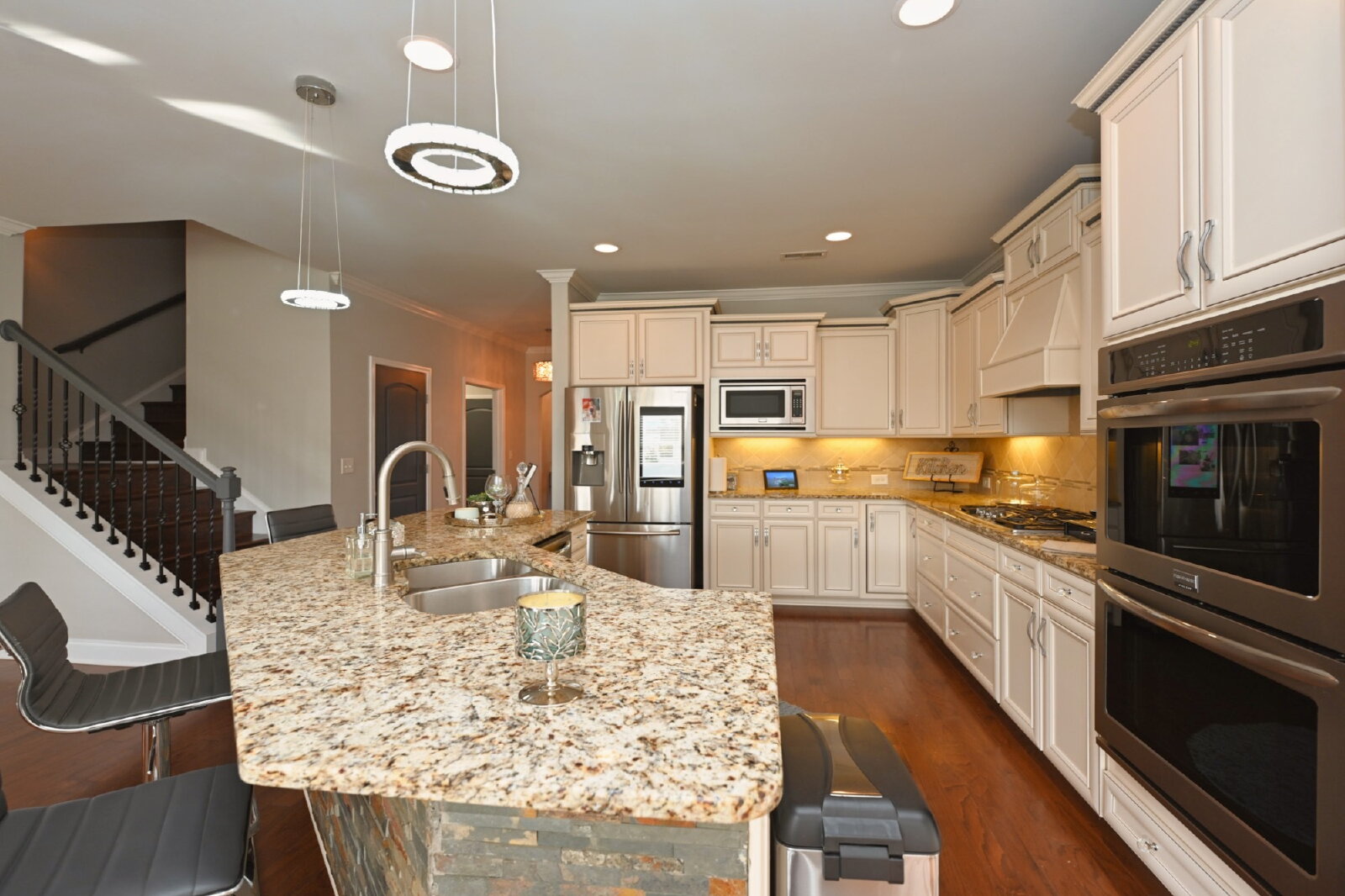 Chef's kitchen features a center island with stone accents, granite countertops and tile backsplash. Upgraded light fixtures complement the upscale aesthetic.